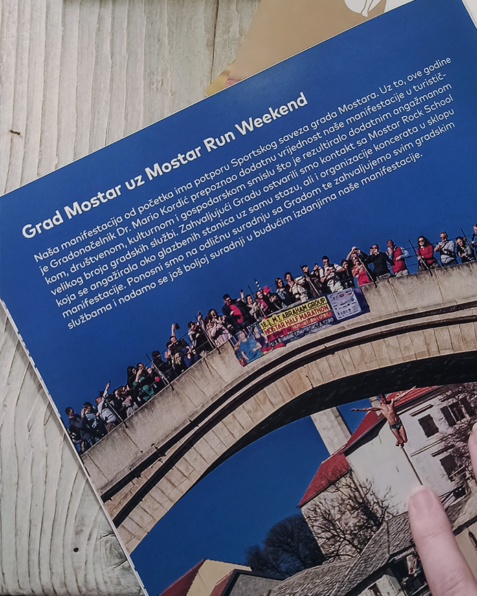 Nakon par godina osjetili smo da je vrijeme za taj sljedeći korak iako ništa racionalno nije bilo na našoj strani. 2017. odlučili smo održati Prvi mostarski polumaraton. Kako Grad Mostar tad nije imao Gradsko vijeće teško je bilo dobiti sve potrebne dozvole i proći sav protokol potreban za organizaciju događaja koji podrazumijeva zatvaranje nekih ulica na par sati. Pregovori sa gradom, definirane trase sa Policijskom postajom Mostar, ishođenje dozvola od MUP-a, kako skupiti 200 volontera potrebnih za sigurnost trase, pregovori sa sponzorima samo su neki izazovi sa kojima smo se sučili. Imali smo sreće, da smo u svim tim segmentima, prije ili kasnije, naišli na ljude otvorene da nam izađu u susret te da smo upornošću uspjeli u svom naumu i uspješno organizirali prvi Mostarski polumaraton. Premda prvi, okupio je oko 400 učesnika iz 16 zemalja. Od tada naš događaj samo raste, polako ali sigurno.